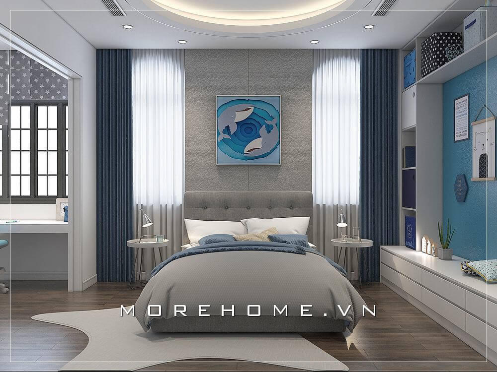 Giường ngủ gỗ công nghiệp bọc vải toát lên vẻ đẹp năng động, trẻ trung tại phòng ngủ bé trai