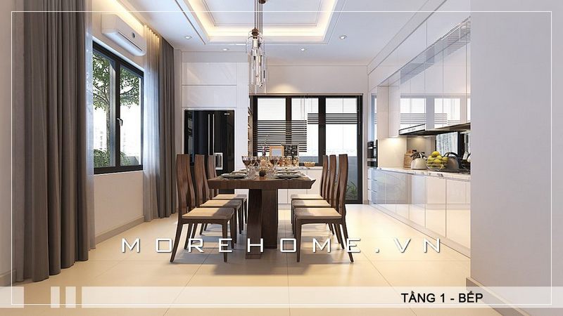 Thiết kế bàn ăn đẹp mang tông màu veneer nâu sữa phù hợp với phong cách thiết kế của căn nhà.