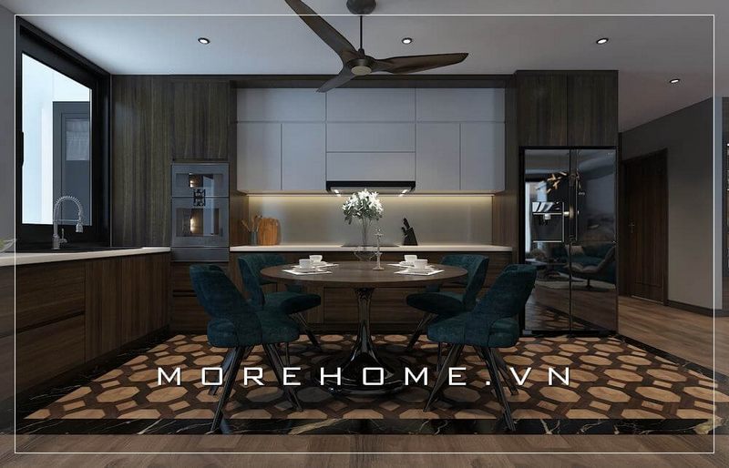 Thiết kế nội thất phòng bếp với tone màu trầm từ gỗ tự nhiên tạo cảm giác sang trọng và cuốn hút