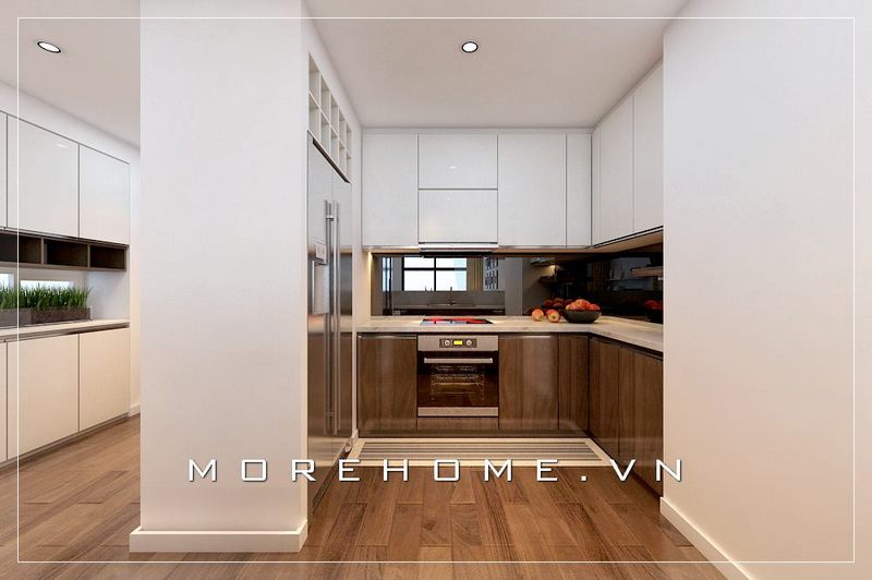 Thiết kế nội thất phòng bếp chung cư với tone màu trắng hiện đại tạo nên không gian thoáng mát và sạch sẽ hơn