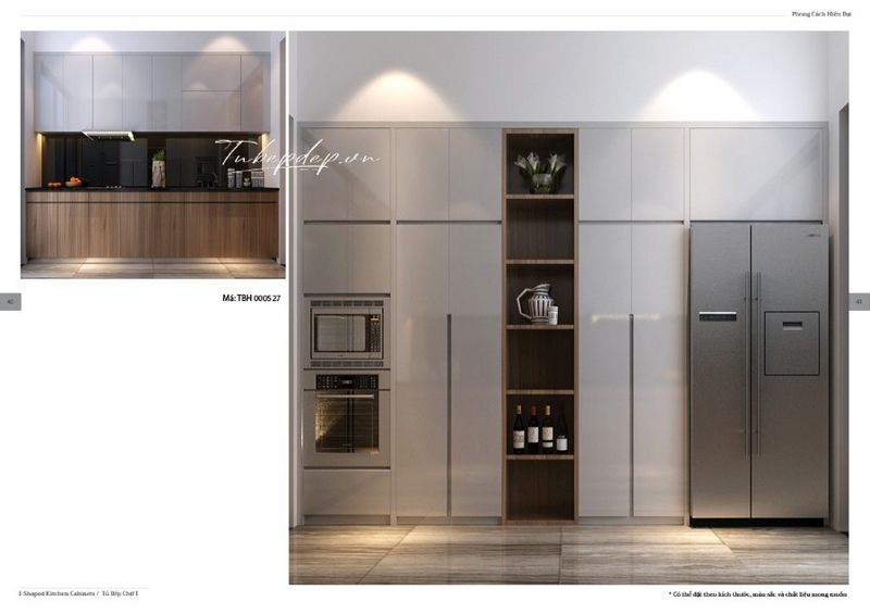 Mẫu tủ bếp gỗ công nghiệp kiểu hiện đại có thiết kế chia ngăn kiểu đa dạng thuận tiện lưu trữ đồ đạc