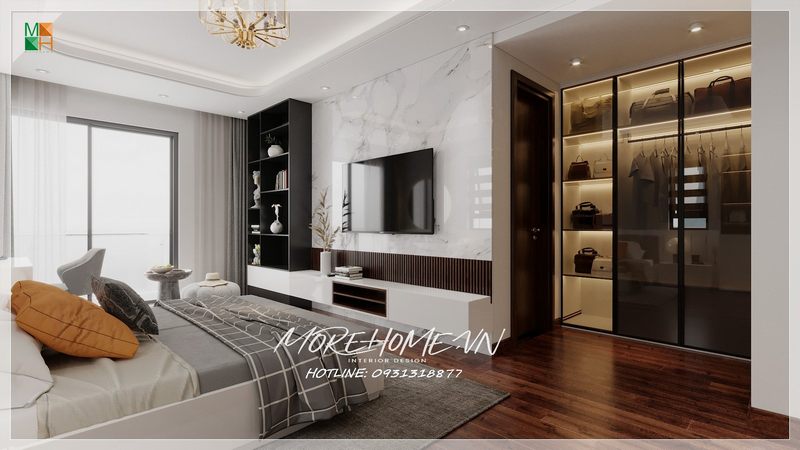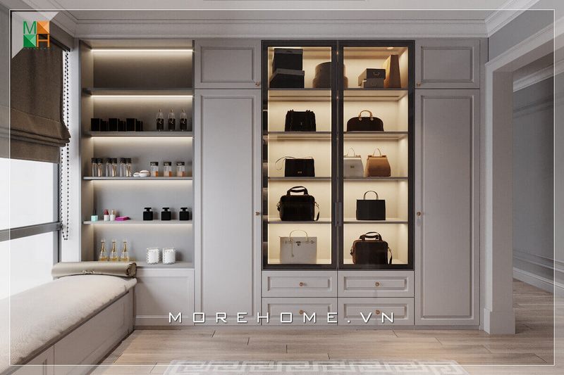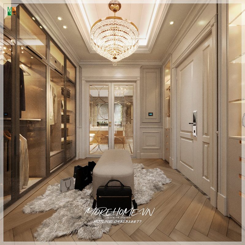 Ấn tượng với tủ quần áo tân cổ điển cánh kính thiết kế âm tường kịch trần tối giản diện tích căn phòng trở nên gọn gàng và rất hợp lý.