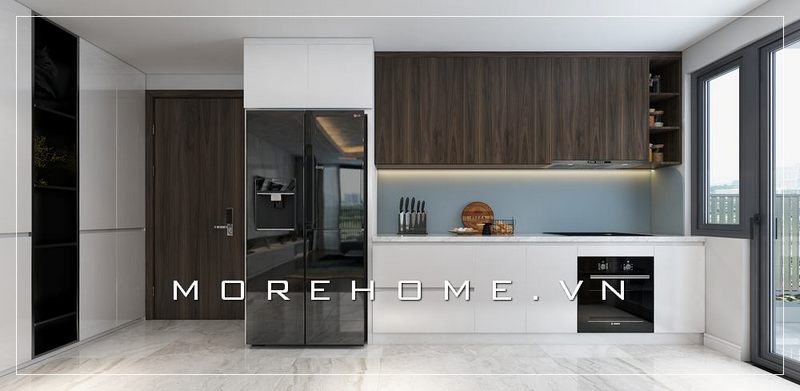 Một trong những cách hiệu quả nhất để tạo cảm giác rộng rãi hơn là sử dụng ánh sáng tự nhiên. Cửa sổ lớn hoặc cửa kính trượt không chỉ mang lại nguồn sáng dồi dào mà còn giúp kết nối không gian bếp với thiên nhiên bên ngoài, làm cho căn bếp trở nên sống động hơn. Bên cạnh đó, việc sử dụng màu sắc sáng cho tường và nội thất cũng góp phần phản chiếu ánh sáng, tạo cảm giác thoáng đãng.