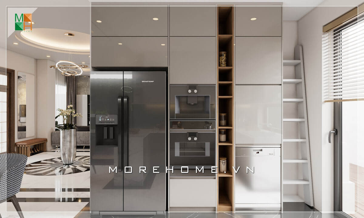 Nội thất phòng bếp biệt thự hiện đại với tủ bếp chữ i gỗ An Cường màu xám